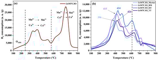 TPR-H2 profile of (a) LMCO sample and (b) perovskite–carbon composites obtained by mortar mixing, ball milling, and hydrothermal and heat treatments.