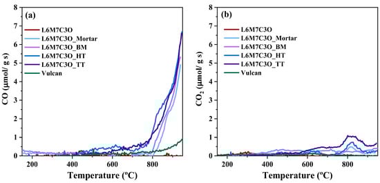The TPD technique is a highly effective analytical tool for investigating the strength and nature of the interfacial interaction in perovskite–carbon composite materials. These experiments provide valuable insights into these interactions, which have been identified as key factors in the electrocatalytic activity of the composite [14]. Figure 6 presents the TPD profiles for the different materials in which CO and CO2 were the main desorbed species identified.