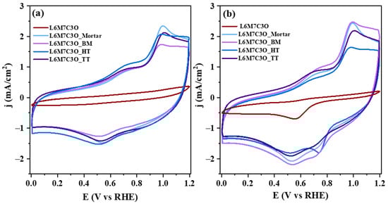 The main difference observed is the lower electrochemical capacitance and conductivity of the pure metal oxide perovskite sample compared to the perovskite–carbon composites. This is evidenced by the tilted voltammogram of the pure perovskite, which often indicates a high ohmic resistance that overlaps with the recorded current densities. The perovskite–carbon composites display two faradaic processes related to the Mn2+/Mn3+ redox process occurring at around 0.7 V and a peak around 1.0 V related to the formation of MnOOH species [73,74]. No significant differences are observed in the voltammograms of the composites.