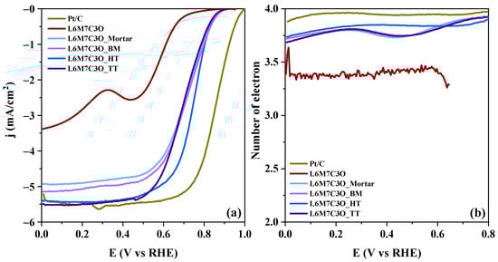 The number of electrons transferred in the ORR can be observed in Figure 8b. All perovskite–carbon composites exhibit a nearly four-electron transfer pathway, with the L6M7C3O_HT sample showing the highest value of electrons transferred at 0.4 V. However, the limiting current obtained for this sample shows that this electrocatalyst can be an alternative to commercial Pt/C for this reaction.
