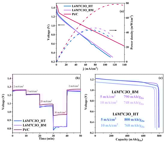 (a) Discharge polarization curves and power density for L6M7C3O_BM and Pt/C. (b) Discharge curves from 2 to 50 mA/cm2. (c) Galvanostatic discharge curves at 5 and 10 mA/cm2 for L6M7C3O_BM and L6M7C3O_HT samples.