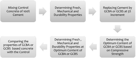 This study has several objectives. Firstly, the optimal amount of GCBA or GCBS that can replace cement, with and without nanomaterials, was determined by comparing their compressive strength to a cement-based control. Compared to the control, the effects of replacing cement with optimum amounts of GCBA or GCBS on the fresh, mechanical, and durability properties were evaluated. Finally, the impacts of the GCBA and GCBS properties on flow, water requirements, strength activity index (SAI), and compressive strength of a mortar were assessed.