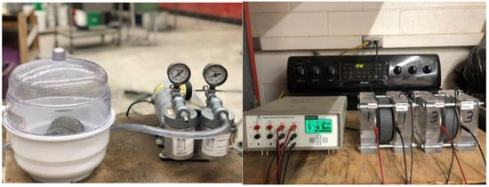 The concrete’s permeability to chloride ions was measured using the Rapid Chloride Permeability Test (RCPT) following the ASTM C1202 standard [], as shown in Figure 3. The RCPT test was conducted after 28 and 56 days of curing. The top 5 cm of the cylindrical specimen of 10 cm diameter and 20 cm length was sawed off and utilized for the RCPT test. For every RCPT test, two cylindrical specimens were sawed off at each testing period. The test assesses the concrete’s susceptibility to chloride ions, an important aspect when predicting the likelihood of steel reinforcement corrosion. The test’s findings are reported in coulombs, reflecting the total charge applied to the concrete during the test.