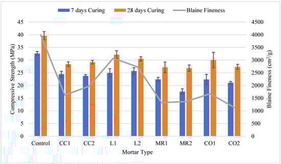 The MR2 sample had the lowest compressive strength compared to all other GCBA and GCBS samples. The MR2 sample’s fineness was higher than the CO2 samples; however, the MR2 sample’s chemical composition revealed a lower amount of CaO than CO2, which could be the reason for the mortar’s low early strength after 28 days. The MR1 sample had a higher compressive strength than the MR2 sample after 7 and 28 days of curing; however, the percentage increase in compressive strength was 17.5%, whereas it was 34.4% for MR2. The compressive strength of the MR1 and MR2 samples was nearly the same after 28 days. The Blaine fineness properties for MR2 were finer than MR1 (see Table 2). These results indicate that MR2 could possess better pozzolanic qualities than MR1 despite the lower compressive strength at 7 and 28 days.