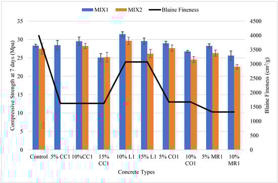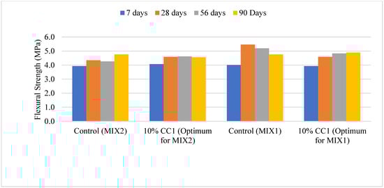 MIX1 mix design’s optimum CC1 GCBA content was 10% without nanoclay; however, this content can be increased by adding nanoclay. Selvasofia et al. [] suggested that higher amounts of GCBA could be used if 2% of the cement was replaced with nanomaterials; therefore, 2% nanoclay was added, and the CC1 content was increased to 15%. The total cement replacement was 17%. The percentage of nanoclay and CC1 were then either increased or decreased based on the results, and the optimum nanoclay content was determined for the amount of GCBA added.