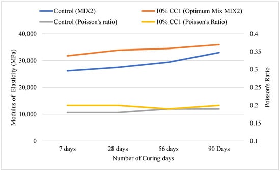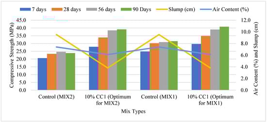 Specimens were prepared for all mechanical and durability tests once the optimum content was determined for the CC1 mix. This mix was similar in volume to the control mix. The fresh properties, such as slump, unit weight, and air content, were determined. Table 6 lists the fresh properties of the control mixes and those containing 10% CC1. The optimal MIX1 and MIX2 air content and slump values were lower than the control, and the unit weight was higher.