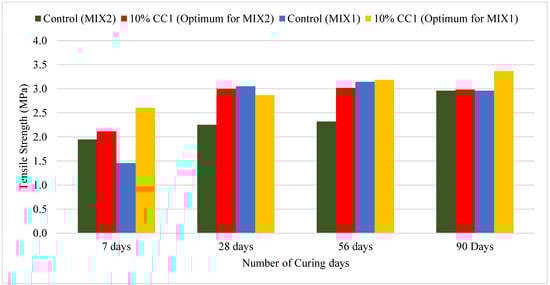 Figure 7 illustrates the splitting tensile strength of the control concrete compared to the tensile strength of the Coal Creek GCBA-based concretes with an optimum content of 10%. The splitting tensile strength of the MIX1 containing 10% CC1 was greater than the control at 7 and 90 days, similar at 56 days, and less at 28 days. The 10% CC1 mix’s tensile strength was only 8.2% of the compressive strength, and the control’s tensile strength was 10% after 56 days of curing. The compressive strength was much higher than the control; however, the tensile strength was approximately the same. Compressive strength is the concrete’s ability to resist compression; however, tensile strength is localized to a specific area, which could have resulted in lower or similar tensile strength compared to the control. Mangi et al. [] discovered that the splitting tensile strength of concrete increased by 8% after replacing cement with 10% GCBA of Blaine fineness 3895 g/cm2. The splitting strength decreased when finer GCBA with Blaine fineness of 4638 g/cm2 was used.