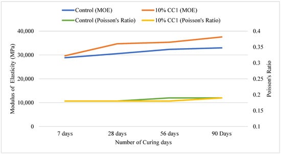 Cylindrical specimens 10 cm in diameter by 20 cm in length were cast to test the compressive strength, splitting tensile strength, modulus of elasticity (MOE), and Poisson’s ratio following AASHTO R39 [] using a UTM after 7, 28, 56, and 90 days of curing. All specimens were moist cured in the curing room following the AASHTO R39 standard []. Compressive strength was tested following AASHTO T22 M/T [], the splitting tensile strength was tested following AASHTO T 198 [], and MOE and Poisson’s ratios were determined according to the ASTM C469 standard []. Flexural strength was determined following the AASHTO T97 standard []. Beam specimens sized 15 cm × 15 cm × 53 cm were cast according to the AASHTO T23 standard []. At each testing period, three cylinders for the compressive strength test, two cylinders for the splitting tensile strength test, two cylinders for MOE and Poisson’s ratio test, and two beams for the Flexural Strength test were used.