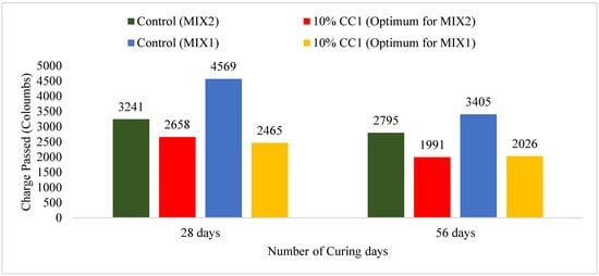 Figure 11 illustrates the charges passed in coulombs for the control mixes and the MIX1 and MIX2 containing 10% CC1. There is a significant difference in concrete permeability between the control and the MIX1 containing 10% CC1 after 28 days of curing. The charge passed in the control after 28 days was 84% higher than in the 10% CC1 MIX1. The 56-day permeability also indicates less charge passing through the GCBA-based concrete compared to the control. The charge passed in the control at 28 days was only 21% more than in the MIX2 containing 10% CC1. The control passed 40% more charge than the 10% CC1 MXI2 at 56 days. The MXI2 control’s permeability was lower than the MXI1 control because the amount of cement in the MXI2 was higher, which reduced concrete permeability. Kosmatka and Wilson [] also revealed that using SCMs (Supplementary Cementitious Material) can reduce concrete permeability. GCBA-based concrete permeability decreases more at later ages due to more pozzolanic reactions taking place.
