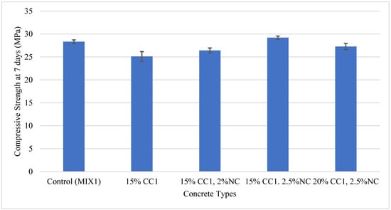 Figure 12 illustrates the 7-day compressive strength of MIX1 containing CC1 and nanoclay. The concrete containing 2% nanoclay (NC) and 15% GCBA had a lower compressive strength than the control; therefore, the next mix contained 15% CC1 and 2.5% NC, which resulted in higher compressive strength. MIX1 containing 20% GCBA and 2.5% nanoclay was created; however, the compressive strength was lower than the control. Nanoclay is expensive; therefore, experiments with 3% nanoclay and 20% CC1 were not performed. Due to this expense, the optimum content for nanoclay was established as 2.5%. Incorporating 2% nanoclay in the 15% CC1 concrete mix increased the compressive strength by approximately 5% compared to the 15% CC1 concrete. Adding 2.5% nanoclay increased the compressive strength of the 15% CC1 concrete by approximately 16%.