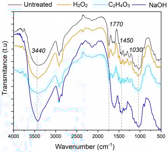 Figure 1 shows the FTIR results for the neat and treated jute woven fabrics. The band at 3440 cm−1 is related to the presence of free hydroxyl groups of the fibers’ cellulosic structure [23]. The sharp absorption peak at 3440 cm⁻¹ in the infrared spectrum for the NaOH-treated material indicates changes in hydrogen bonding, possibly due to the removal of hydroxyl groups during the treatment process. These groups can be present in cellulose and hemicellulose. The peak at 1770 cm−1 is associated with the C=O stretching vibration and stretching of the ester linkage in hemicelluloses or lignin [24]. At 1450 cm−1, the peak is related to C-H vibrations [25]. The peak at 1030 cm−1 is associated with the stretching vibration of O-C-O present in cellulose and hemicellulose, and the C-O and C-C stretching vibrations [26].