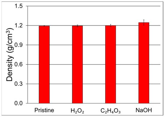 This consistency suggests that the chemical treatments applied to the jute fibers did not cause a substantial alteration in the overall density of the resulting composites. Comparisons with the existing literature further support these findings. The observed density range of 1.1–1.2 g/cm³ for the jute/polyester composites aligns with similar composite systems reported in previous studies [29]. The consistency in density across different samples and conformity with literature values indicate that the chemical treatments did not significantly impact the mass per unit volume of the composites.