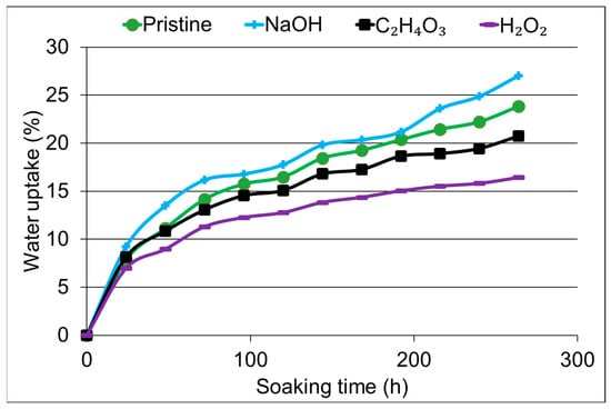 The water absorption results depicted in Figure 4 provide crucial insights into the interaction between chemical treatments, surface modifications, and the hydrophilic behavior of the jute/polyester composites. Notably, the NaOH-treated composites exhibited the highest water absorption, in contrast to the other treatments, including the neat or pristine fibers. This observation aligns with the significant increase in intensity of the band at 3440 cm−1 in the FTIR spectra, which is associated with OH- groups on the fiber surface, arising from either exposed cellulose or free water. The intensified band suggests a higher presence of hydrophilic groups, contributing to increased water absorption. This trend is consistent with previous studies on natural fibers, where increased hydrophilicity, marked by exposed OH- groups, is linked to higher water absorption [30,31].