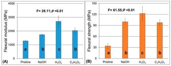 Figure 5 shows the effect of the fiber treatments on the flexural strength of the samples. These samples were manufactured as we explained in Section 2.3. All treatments proved to be effective in increasing the flexural strength and modulus of the composites, with hydrogen peroxide being noticeably effective. This is in line with the water absorption results herein found, which could indicate better adhesion at the fiber/matrix interface and, therefore, increased stress transfer at the interface, leading to better flexural properties. For mercerized fibers (i.e., treated with alkali), even though there were some changes in the surface chemical composition, as evidenced by the FTIR results, the changes were not as pronounced as when the other treatments were used, although an improvement from pristine fibers was found.