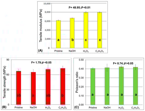 The results for the tensile strength, modulus, and Poisson ratio of the composites are presented in Figure 6. The tensile modulus increased when chemically treated jute fibers were used. When H2O2 and peracetic acid treatments were used, an increase in the rigidity of the composites was observed, and the tensile strength was comparable to NaOH-treated composites. These results could indicate that the fiber/matrix adhesion was effective until the formation of permanent mechanical damage in the composites. Sever et al. [32] studied the properties of jute fabric/polyester composites treated with sodium hydroxide and observed a marginal increase in the tensile strength for the treated fibers in comparison with untreated ones. The authors reported an increase in this property only when other treatments were used in conjunction with the alkali treatment and attributed this behavior to the added hydrophobicity promoted by additional treatments, increasing the compatibility of the fibers with the matrix.