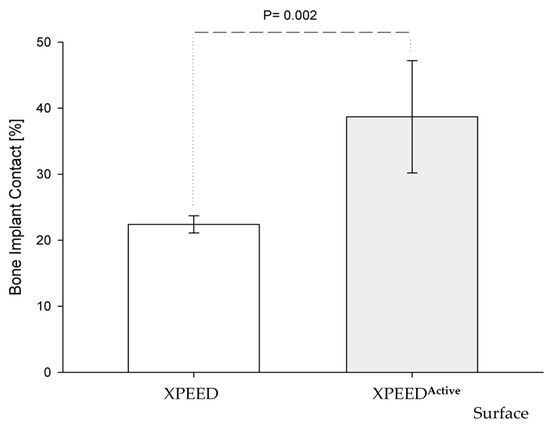 Graph of BIC rate vs. implant surfaces. The amount of bone around XPEEDActive implants was significantly more than XPEED implant (unpaired t-test, p = 0.002).
