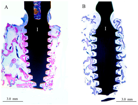 Images at 20× magnification. In the XPEEDActive sample (A), after 4 weeks of healing, a thin layer of bone appeared to have grown in direct contact with the implant surface. (I) implant, double-stain Azur II and fuchsine acid. In the XPEED sample (B), after 4 weeks of healing, bone growth appeared to be in direct contact with implant surface in some areas. (I) implant, double-stain Azur II and methylene blue.