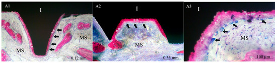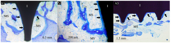 Images of XPEED at 50× (A1), 1000× (A2), and 25× (A3). After four weeks, the newly formed bone (black arrows) appeared to be present near the implant surface with some bone struts in contact with the implant, showing a moderate level of osteoconduction. (Black arrows) mineralized bone, (MS) marrow spaces, and (I) implant. Double stain with Azur II and methylene blue.