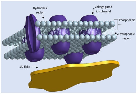Additionally, a technique for producing square diaphragms of 4H-SiC and 6H-SiC through a bulk micromachining process is shown in [6]. These studies define ways of fabricating hexagonal SiC surfaces. These materials include hexagonal SiC, which has been the subject of growing interest [6,7]. Moreover, there are numerous examples of the growth and fabrication of high-quality GaN and ZnO layers [8,9,10,11,12,13,14,15,16]. Importantly, sonification techniques have been demonstrated to be effective in dispersing 2D nanostructures in water [9]. Of importance for the present study, 2H-SiC, ZnO, and GaN exhibit internal built-in spontaneous polarizations that are essential for the present analysis. These self-polarizing semiconductor materials are of growing interest as their peculiar physical and chemical properties facilitate their application in various fields [17]. Now that we have established that stable SiC, ZnO, and GaN flakes can be fabricated, in this paper, we investigate the electric potential manifested by the two-dimensional surfaces made of these naturally spontaneously polarized materials in an aqueous medium that comprises cells with voltage-gated ion channels along their cell membrane, as shown in Figure 2.