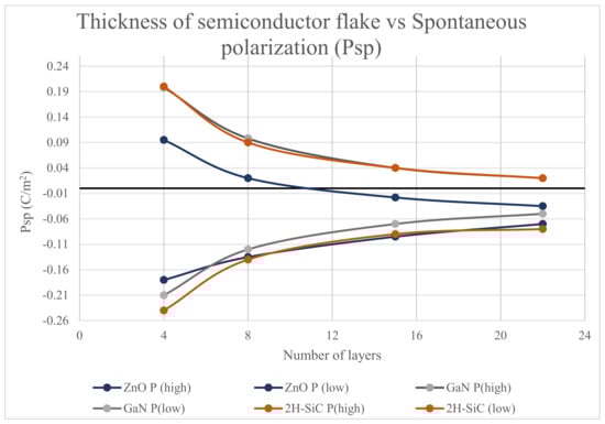 As the material with a given spontaneous polarization becomes thicker [27,28] upon stacking c1 and c2 units successively to increase the layer thickness, the values of P alternate between P (high) and P (low) forming two separate curves for P, which merge for thicknesses > 50 layers to a common asymptotic value, as shown in Figure 3. The values of the spontaneous polarizations are shown in Table 1 for ZnO, GaN, and 2H-SiC thicknesses of 4 layers, 8 layers, 15 layers, and 22 layers, respectively.