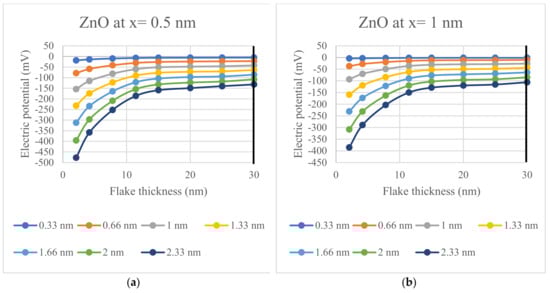 Figure 4. The calculated electric potential for a ZnO semiconductor interface for Debye lengths ranging between 0.33 nm and 2.33 nm: (a) Electric potential calculated for x = 0.5 nm; (b) Electric potential calculated for x = 1 nm.