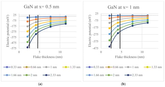Figure 5. The calculated electric potential for a GaN semiconductor interface for Debye lengths ranging between 0.33 nm and 2.33 nm: (a) Electric potential calculated for x = 0.5 nm; (b) Electric potential calculated for x = 1 nm.