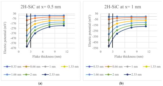 Figure 6. The calculated electric potential for a 2H-SiC semiconductor interface for Debye lengths ranging between 0.33 nm and 2.33 nm: (a) Electric potential calculated for x = 0.5 nm; (b) Electric potential calculated for x = 1 nm.