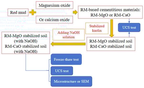 A flowchart (Figure 2) has been inserted in this study to better show our methodology. Red mud is first combined with magnesium oxide (or calcium oxide) to form a cementitious material, which is then used to stabilize kaolin. Specimens of both the cementitious material and the stabilized soil were used for UCS testing. Finally, with the addition of NaOH solution to the stabilizer, the stabilized soil (with NaOH) was used for freeze–thaw testing, UCS testing, and microstructure or SEM testing.