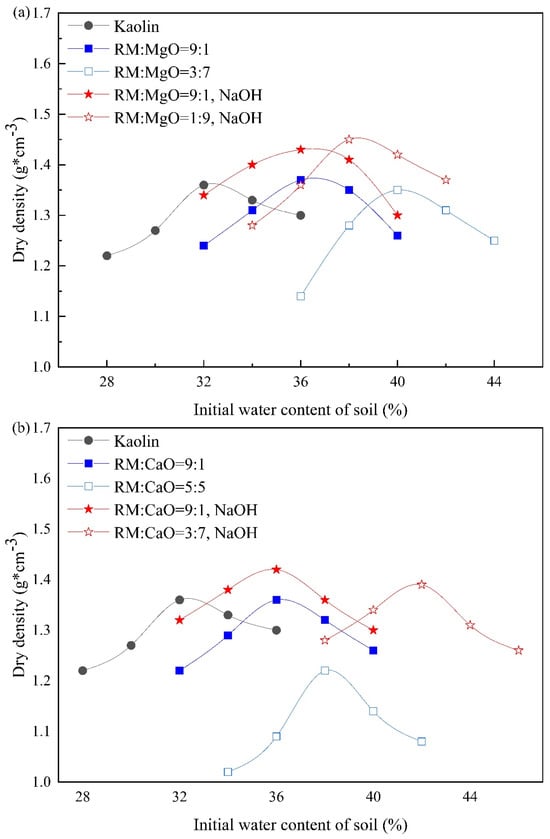 Compaction curves for stabilized soil: (a) RM–MgO (or NaOH) stabilized soil; (b) RM–CaO (or NaOH) stabilized soil.