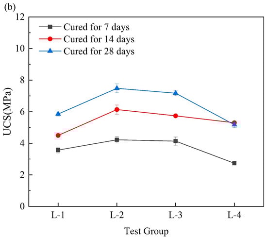 (a) UCS of RM–MgO cementitious material; (b) UCS of RM–CaO cementitious material.