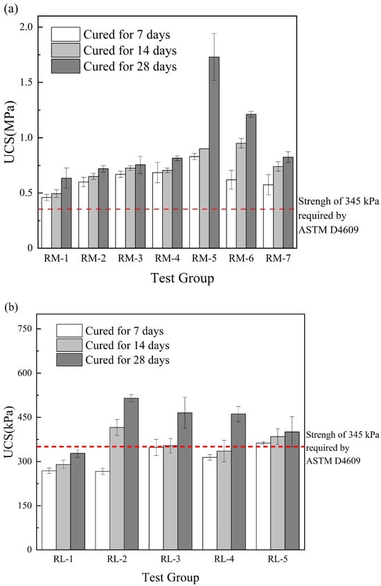 Figure 5a shows the change in the UCS of the RM–MgO stabilized soil. The UCS of the stabilized soil first increased and then decreased as the content of RM decreased. The 7-day and 14-day UCS values of the stabilized soils were most significantly enhanced when the RM content was 50–60%. At 28 days, the RM-5 (RM:MgO = 5:5) reached a maximum UCS of 1.73 MPa. Figure 5b shows the relationship between the UCS and the content of RM for the RM–CaO stabilized soils. After 7 days of curing, as the content of the RM in the mixture decreased, the UCS gradually increased, and when the mass ratio of the RM to CaO was 5:5, the UCS was optimal. However, when the curing times were 14 and 28 days, the UCS of stabilized soil first increased and then decreased as the content of the RM in the mixture decreased. At this time, when the mass ratio of RM to CaO was 8:2, the maximum UCS was obtained. This might be because the RM activity was not fully activated when the MgO (or CaO) content was low. As the content of MgO (or CaO) increased, its activity was fully activated to reach the maximum UCS value. However, when the optimum content of MgO (or CaO) was exceeded, the MgO (or CaO) would be dispersed in the soil in its natural state, which would weaken the connection between the soil and lead to a reduction in UCS [,]. ASTM [] advised that the UCS of admixtures for improving the engineering properties of fine-grained soil should not be less than 345 kPa. For the RM–CaO stabilized soil, only the 7-day UCS for RL-5 (RM:CaO = 5:5) met this requirement, only the 14-day UCS for RL-5 and RL-2 (RM:CaO = 5:5 and 8:2) met this requirement. Additionally, the 28-day UCS of RL-2, RL-3, RL-4, and RL-5 (RM:CaO = 8:2, 7:3, 6:4, and 5:5) met this requirement. Conversely, the UCS of the RM–MgO stabilized soil met this requirement at all curing times. Overall, the UCS of the RM–CaO stabilized soil was lower than that of the RM–MgO stabilized soil.
