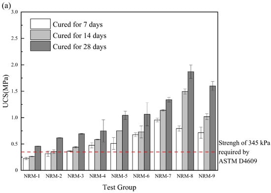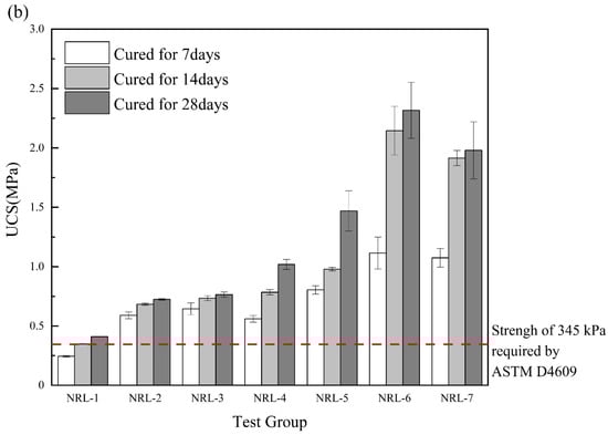 As shown in Figure 6a, the UCS of the RM–MgO stabilized soil increased after adding NaOH. With the decrease in RM content, the UCS showed a trend of increasing and then decreasing, and the maximum 7-day UCS was obtained when the RM content was 30%, while the maximum 14-day and 28-day UCS were obtained when the RM content was 20%. As seen in Figure 6b, for the RM–CaO stabilized soil, the UCS of the soil with NaOH was much higher than that of the stabilized soil without NaOH. As the content of RM continued to decrease, the UCS of the stabilized soil showed a trend of first increasing and then decreasing. When the mass ratio of RM to CaO was 4:6, the maximum UCS of the stabilized soil was obtained. Although RM–MgO (or RM–CaO) could accelerate the UCS development of stabilized soils, excessive residual MgO (or CaO) negatively affected the UCS of the stabilized soils. The optimal ratios for the stabilized soil with NaOH (RM:MgO = 2:8, RM:CaO = 4:6) require more MgO (or CaO) than the optimal ratios for the stabilized soil without NaOH (RM:MgO = 5:5, RM:CaO = 8:2), probably because the addition of NaOH requires more MgO (or CaO) to participate in the hydration reaction, which continues to increase in UCS. Equation (3) was used to calculate the rate of the UCS enhancement of the soil stabilized with RM–MgO (or RM–CaO). The UCS enhancement rate of the RM–MgO stabilized soil ranged from 8.09% to 66.67%, while the UCS enhancement rate of the RM–CaO stabilized soil ranged from 204.6% to 346.6%. According to Cristelo et al. [], the addition of NaOH accelerated the dissolution of silica and alumina, thereby producing more hydration products to increase the UCS of the RM–MgO (or RM–CaO) stabilized soil. The UCS of all specimens generally met the requirements of ASTM [] specifications.