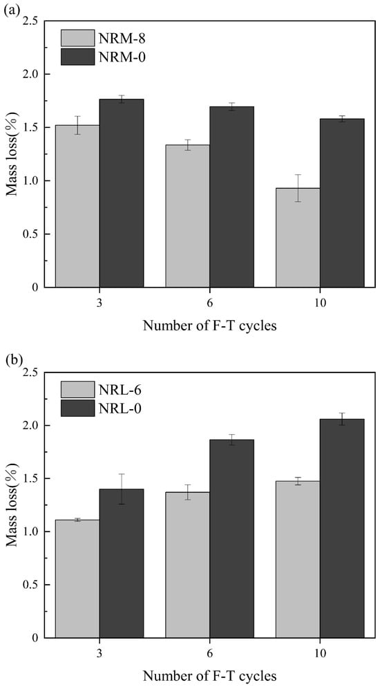 Mass loss rate during freeze–thaw cycles: (a) NRM-8, NRM-0; (b) NRL-6, NRL-0.
