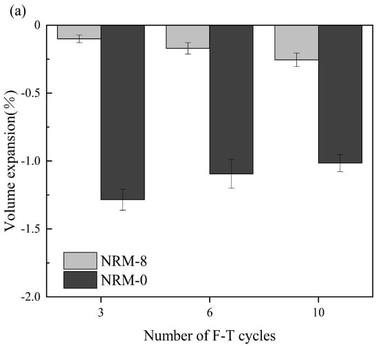 Figure 8 shows the volume expansion rate of the stabilized soil with the number of cycles. The volume expansion rate of the RM–MgO stabilized soil increased slightly with the increase in cycle number. Conversely, the volume expansion rate of the RM–CaO stabilized soil showed an increasing trend with the cycle number. As the cycle number rose from zero to three in the RM–MgO stabilized soil, the volume expansion of NRM-8 increased to 0.10% and that of NRM-0 rose to 1.29%. This indicated that the volume expansion of freeze–thaw cycles was suppressed by the addition of RM–MgO. From cycles 3 to 10, the volume expansion of NRM-8 increased to 0.17% and the volume expansion of NRM-0 slightly decreased to 1.10%. Furthermore, NRM-8 showed much lower volume expansion compared to NRM-0. For the RM–CaO stabilized soil, when the cycle number was increased from zero to three, the volume expansion rate started to increase to 0.58% for NRL-6 and to 0.66% for NRL-0. As the cycle number rose to 10, the volume expansion rate of NRL-6 increased to 1.24% and that of NRL-0 increased to 1.52%. Additionally, the volume expansion rate of NRL-6 was always lower than that of NRM-0. The volume change rate of the RM–MgO stabilized soil (or the RM–CaO stabilized soil) was always lower than that of the pure MgO (or pure CaO) stabilized soil for the same cycle number. This indicated that for both stabilized soils, the addition of RM–MgO (or RM–CaO) could effectively prevent the volume expansion caused by freeze–thaw cycles. As the cycle number increased from zero to ten, the volume expansion rate of NRM-8 was much lower than that of NRL-6, indicating that the RM–MgO stabilized soil resisted the volume expansion better. According to the results of Konrad [], the stabilized soil expanded because the temperature difference between the surface and the interior caused water to migrate from the inside to the outside. Some of the pores enlarged by freezing and melting water could not return to their original state, resulting in expansion.