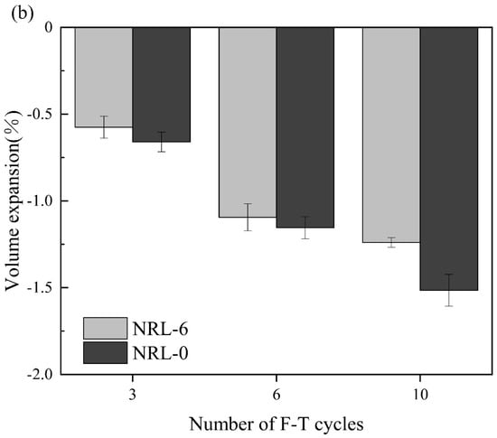 Figure 7 shows the mass loss rate of the stabilized soil with an increasing number of cycles. The mass loss rate of the RM–MgO stabilized soil decreased as the cycle number grew, while that of the RM–CaO stabilized soil increased. For the RM–MgO stabilized soil, as the cycle number grew from zero to three, the mass loss rate of NRM-8 and NRM-0 reached their maximum values of 1.52% and 1.77%, respectively. As the cycle number grew to six, the mass loss rate of NRM-8 started to decrease to 1.34%, while that of NRM-0 decreased to 1.70%. As the cycle number progressed from three to ten, the mass loss rate of NRM-8 decreased more than that of NRM-0. For the RM–CaO stabilized soil, when the cycle number progressed from zero to three, the mass loss rate increased to 1.11% for NRL-6 and 1.40% for NRL-0. As the cycle number progressed to six, the mass loss rate of NRL-6 continued to increase to 1.37% and that of NRL-0 increased to 1.87%, while the increase in the mass loss rate of NRL-6 was less than that of NRM-0. When the cycle number progressed from six to ten, the mass loss rate of NRL-6 continued to increase less than that of NRL-0. The mass loss rate of the RM–MgO stabilized soil (or RM–CaO stabilized soil) was always lower than that of the pure MgO stabilized soil (or the pure CaO stabilized soil) for the same cycle number. This indicated that for both stabilized soils, the addition of RM–MgO (or RM–CaO) can effectively prevent the mass loss caused by freeze–thaw cycles. As the cycle number increased from zero to ten, the mass loss of NRM-8 first increased and then decreased, while the mass loss rate of NRL-6 kept increasing, so the RM–MgO stabilized soil had better resistance to mass loss. The reason for this might be that the expansion stress caused by freezing led to internal cracks in the specimen. Then, more external water was transferred into the internal voids and cracks, thus decreasing the mass loss rate of the specimen. When the mass loss of the specimen due to spalling was higher than the mass gained by water absorption, the mass loss rate of the specimen increased [,].
