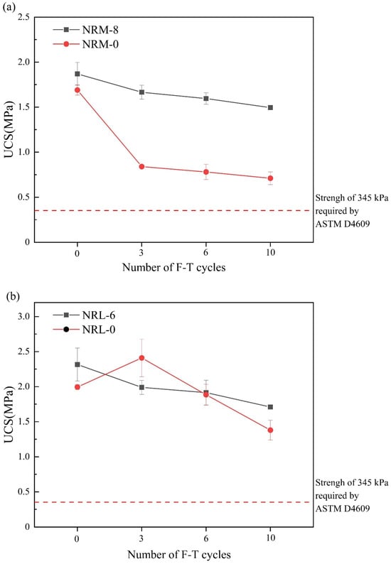 Change in UCS during freeze–thaw cycles: (a) NRM-8, NRM-0; (b) NRL-6, NRL-0 [].