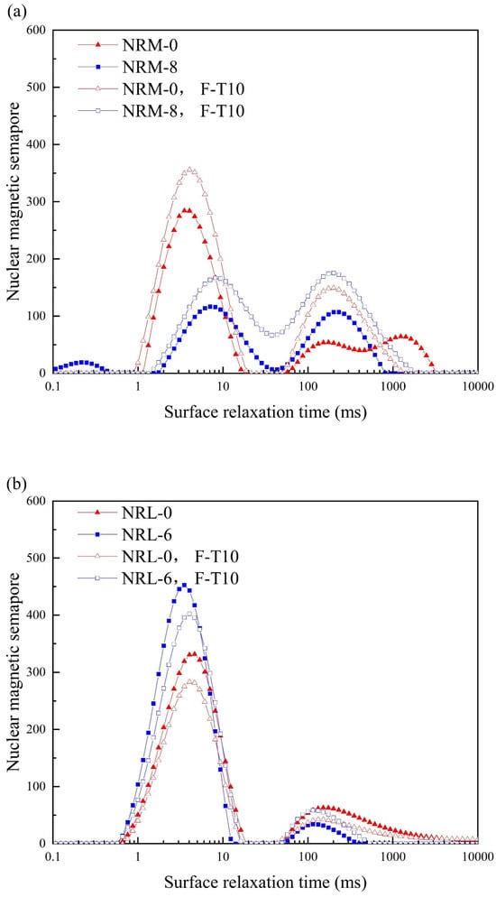 NMR before and after freeze–thaw cycles: (a) NRM-8, NRM-0 and (b) NRL-6, NRL-0. F-T10: after 10 freeze–thaw cycles.