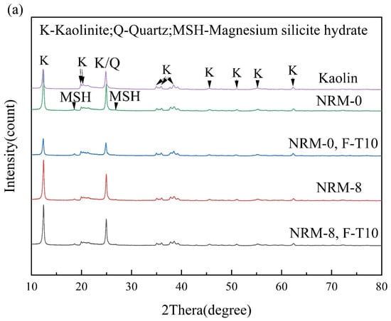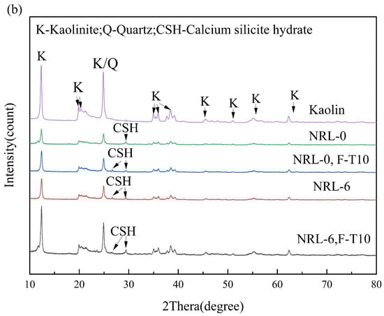 XRD before and after freeze–thaw cycles: (a) NRM-8, NRM-0 and (b) NRL-6, NRL-0. F-T10: after 10 freeze–thaw cycles.