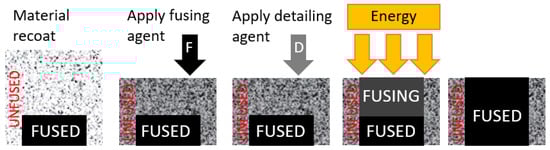 The following Figure 2 shows the process in more detail and graphically. Firstly, the material is deposited on the work surface, then the fusion agent (F) is selectively applied where the powder particles are to be joined together. Afterward, the detailing agent (D) is selectively applied where the fixing effect needs to be reduced or enhanced. In this example, the detailing agent will limit the melting to the boundary and create a part with sharp and smooth edges. The work surface is exposed to melting energy during the further step. Finally, a layer of bonded material is created at the point where the fusion agent is applied. The process is repeated until the entire part is created [22,23,24].