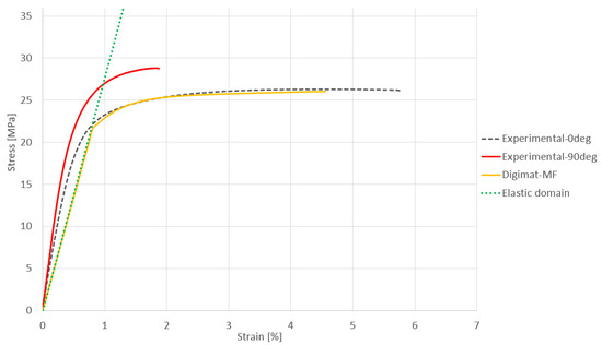 The gray dashed curve represents the stress–strain curve of PA12GB at a 0-degree angle, while the red curve represents the curve for PA12GB at a 90-degree angle. The difference is observed in the plastic domain, where failure occurs much earlier for the 90° test compared to the 0° test.
