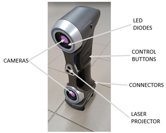 HandySCAN 307TM (Figure 5) is a portable 3D system (scanner) manufactured by Creaform company, (Irvine, CA, USA). The system uses retro-reflective targets to orient the scanning head in a spatial coordinate system and uses a laser projector with multiple laser lines to scan the surface of objects based on triangulation [42]. Two cameras located at opposite ends of the scanner detect both retro-reflective targets (hereinafter referred to as targets) and projected laser lines [43]. The location of the targets is used to create a position model (PM) that orients the scanner in space and defines the appropriate coordinate system. The output is usually a set of (x, y, z) coordinates in a Cartesian coordinate system. Most 3D imaging systems are based on three measurement techniques, i.e., interferometry, triangulation, and beam time of flight [44,45,46].