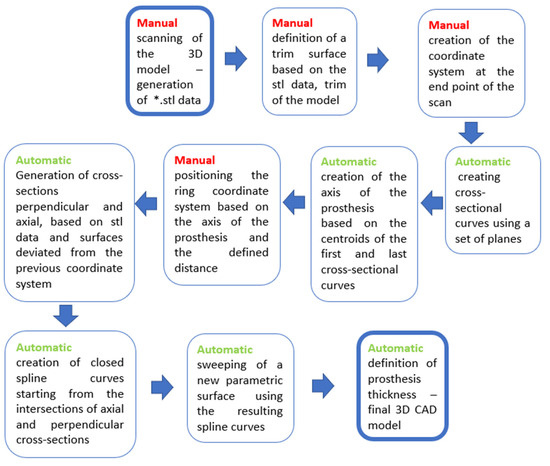 For this reason, a workflow describing individual steps (Figure 8) from the actual scanning to the final prosthesis model was created. Automatic and manual steps are separated by color in the actual workflow (manual steps are in red; automatic steps are in green color).