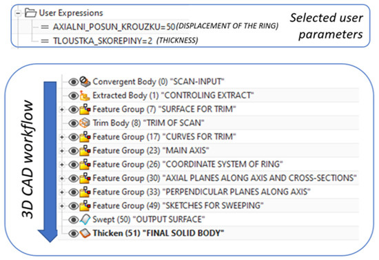 A parametric CAD model is used as part of the automatic generation of the prosthesis model for 3D printing. This is defined using two user parameters (displacement of the center of the connection ring of the prosthesis and the thickness of the prosthesis). The part history (defined by features) within the various CAD software is divided into functional blocks, as can be seen from the following diagram (Figure 10).