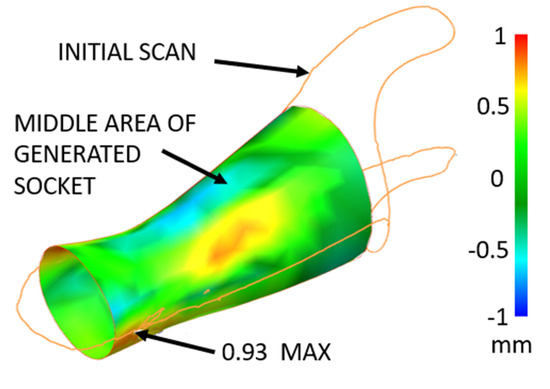 It is possible to allow minor differences. These differences should not be more than 1 mm, as determined by consultation with qualified prosthetists [48,49,50]. Both geometries are shown in the following Figure 11. The design area and overlaying of the original scanned surface (green) and newly designed area (red) are obvious. The same differences were obtained from the 3D printing technology.