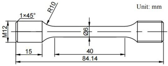 The material studied was GH4720Li, a nickel-based polycrystalline superalloy. This alloy was prepared following a standard sub-solid solution treatment (1110 °C-4 h-oil cooling) and an aging treatment (650 °C-24 h-air cooling + 760 °C-16 h-air cooling). Table 1 shows the main chemical composition of the GH4720Li alloy. The tensile specimen was cut in the radial direction from the turbine disk ingot blank. Figure 1 shows the geometric dimensions of the specimen.