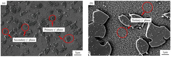 SEM images showing the microstructure of the GH4720Li alloy: the (a) primary γ′ phase and the secondary γ′ phase; the (b) tertiary γ′ phase.