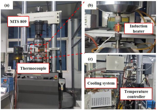 Experimental setup of the thermo-mechanical testing system: (a) a global view of the system; (b) the induction heater; (c) the cooling system and temperature controller.