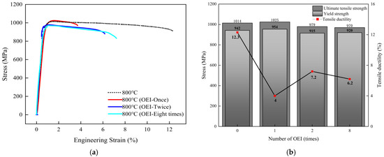 (a) The 800 °C high-temperature tensile stress–strain curve of the GH4720Li material after multiple OEI state treatments. (b) The material’s tensile property data, such as yield strength, ultimate strength, and elongation at break, after multiple OEI state treatments.