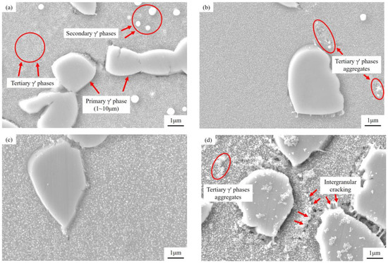 To understand the effects of OEI treatment on the GH4720Li alloy’s microstructure, SEM images with and without OEI treatment are shown in Figure 9. In Figure 9a, the distribution of the tertiary γ′ phase in the alloy’s microstructure without OEI treatment is relatively uniform, with no apparent cracks at the grain boundaries. At the same time, there is a small amount of the secondary γ′ phase distributed around the primary γ′ phase. Figure 9b shows the microstructure of the alloy after the OEI state treatment at 600 °C-700 MPa-30 s. Only a small amount of the tertiary γ′ phase gathers at the grain boundaries, and the alloy microstructure distribution is relatively uniform. Figure 9c shows the microstructure of the alloy after the OEI-state treatment at 700 °C-700 Mpa-30 s, and the secondary γ′ phase is completely dissolved. Figure 9d shows that after the OEI-state treatment at 800 °C-700 Mpa-30 s, obvious microcracks appear at the alloy grain boundaries. The tertiary γ′ phase is aggregated and unevenly distributed around the γ matrix phase of the alloy.
