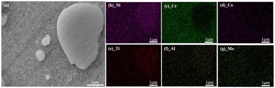 The GH4720Li alloy’s element distribution before OEI treatment (heated to 400 °C and maintained for 5 min). (a) SEM image of the alloy. Distribution of different elements in the alloy: (b) Ni. (c) Cr. (d) Co. (e) Ti. (f) Al. (g) Mo.